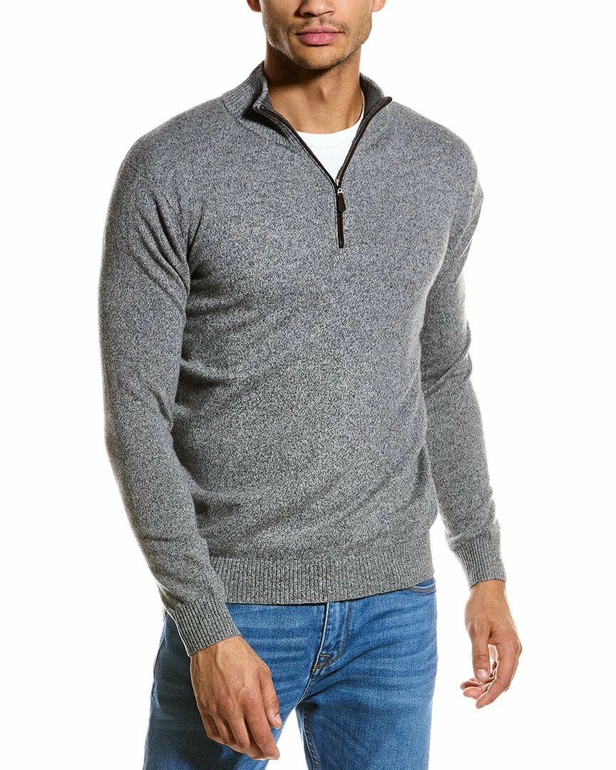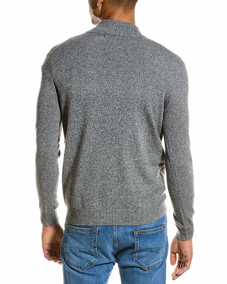 - Suede Trim Cashmere 1/4-Zip Mock Neck Sweater In Graphite/Limestone With Ribbed Trim