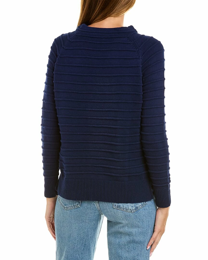 - Raised Stripe Sweater In Navy With Funnel Neck, Raglan Sleeves, And Ribbed Trim
