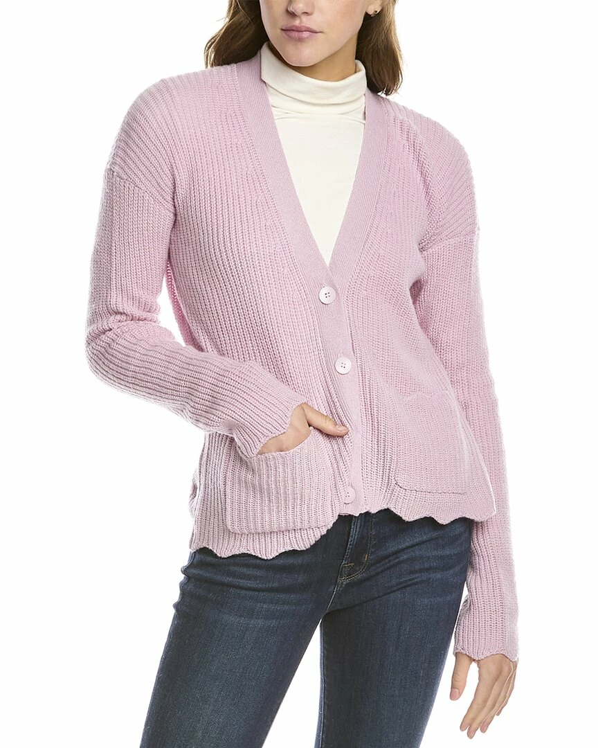 - Scallop Hem Cashmere Cardigan In Pink With Shaker Rib Design, Two Front Pockets, And Dropped-Shoulder Sleeves