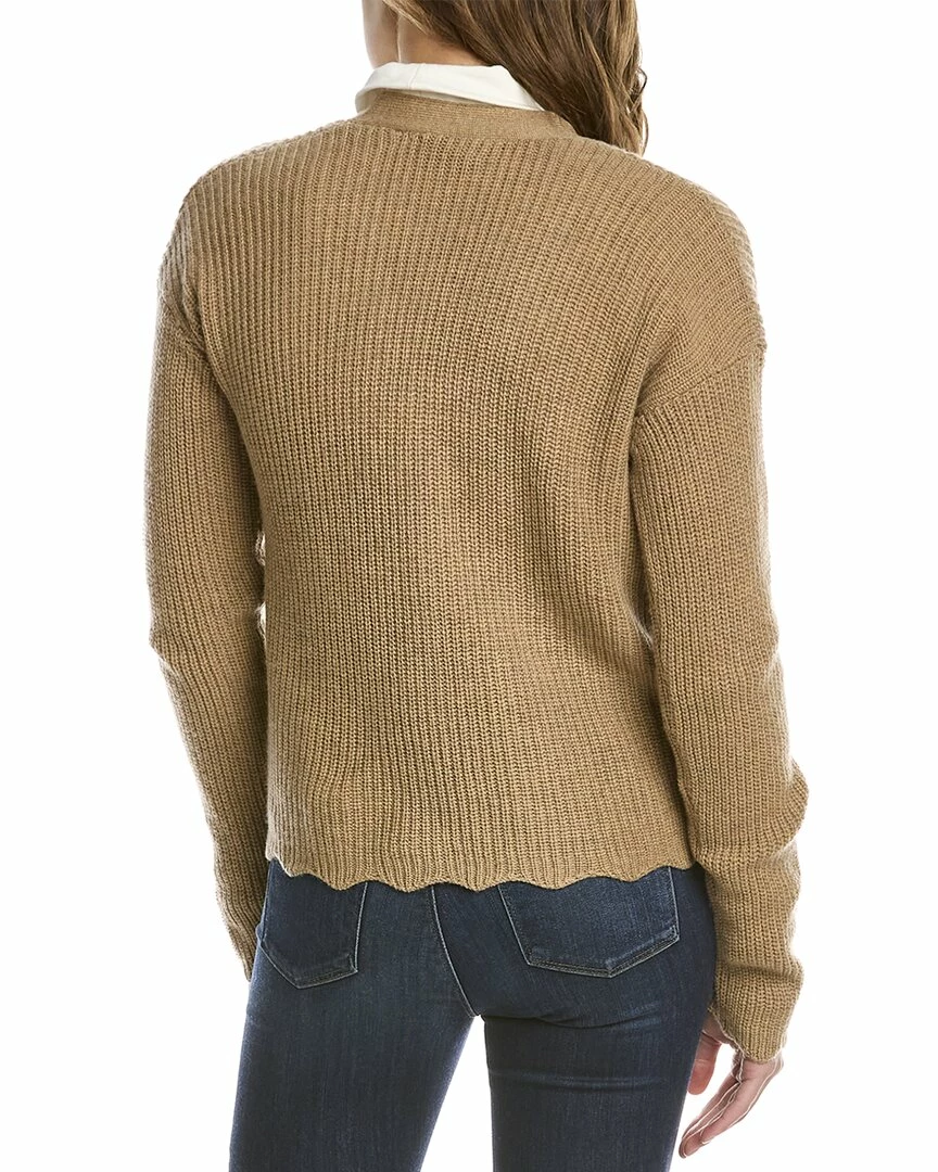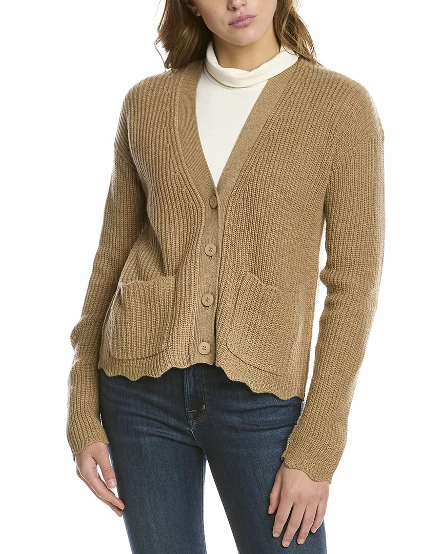- Scallop Hem Cashmere Cardigan In Brown With Shaker Rib Design, Two Front Pockets, And Dropped-Shoulder Sleeves